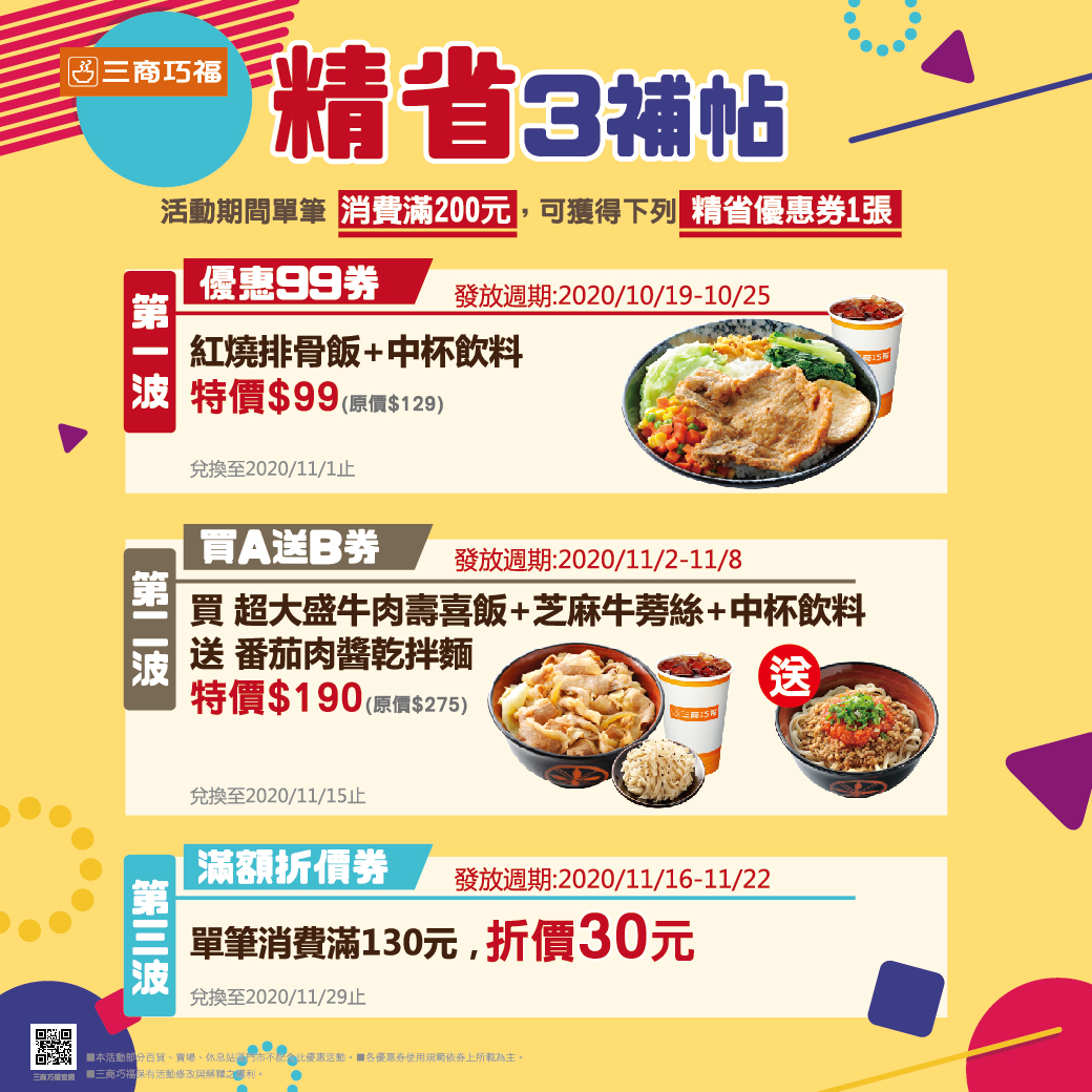 ●活動方式:於發送期間內,來店消費滿200元,每筆消費送指定優惠券一張。 ●發送週期&優惠券內容: [第一波] 優惠99券 發送期間:2020/10/19-10/25 優惠券內容:紅燒排骨飯+中杯飲料,特價$99($129) [第二波] 買A送B券 發送期間:2020/11/2-11/8 消費隔日起至2020/11/15 優惠券內容:買 超大盛牛肉壽喜飯+芝麻牛蒡絲+中杯飲料 送 番茄肉醬乾拌麵 ,特價$190($275) [第三波] 滿額折扣券 發送期間:2020/11/16-11/22 優惠券內容: 消費滿130元,折扣30元 ●注意事項: (1)每券限優惠一次並於結帳時回收。 (2)每筆消費限用一張,滿額折扣不可累折。 (3)外送及線上訂餐系統不適用。 (4)部分百貨賣場、美食街門市不適用。 (5)不可與其他優惠合併使用。 (6)三商巧福保有活動變更、修改及最後解釋之權利。