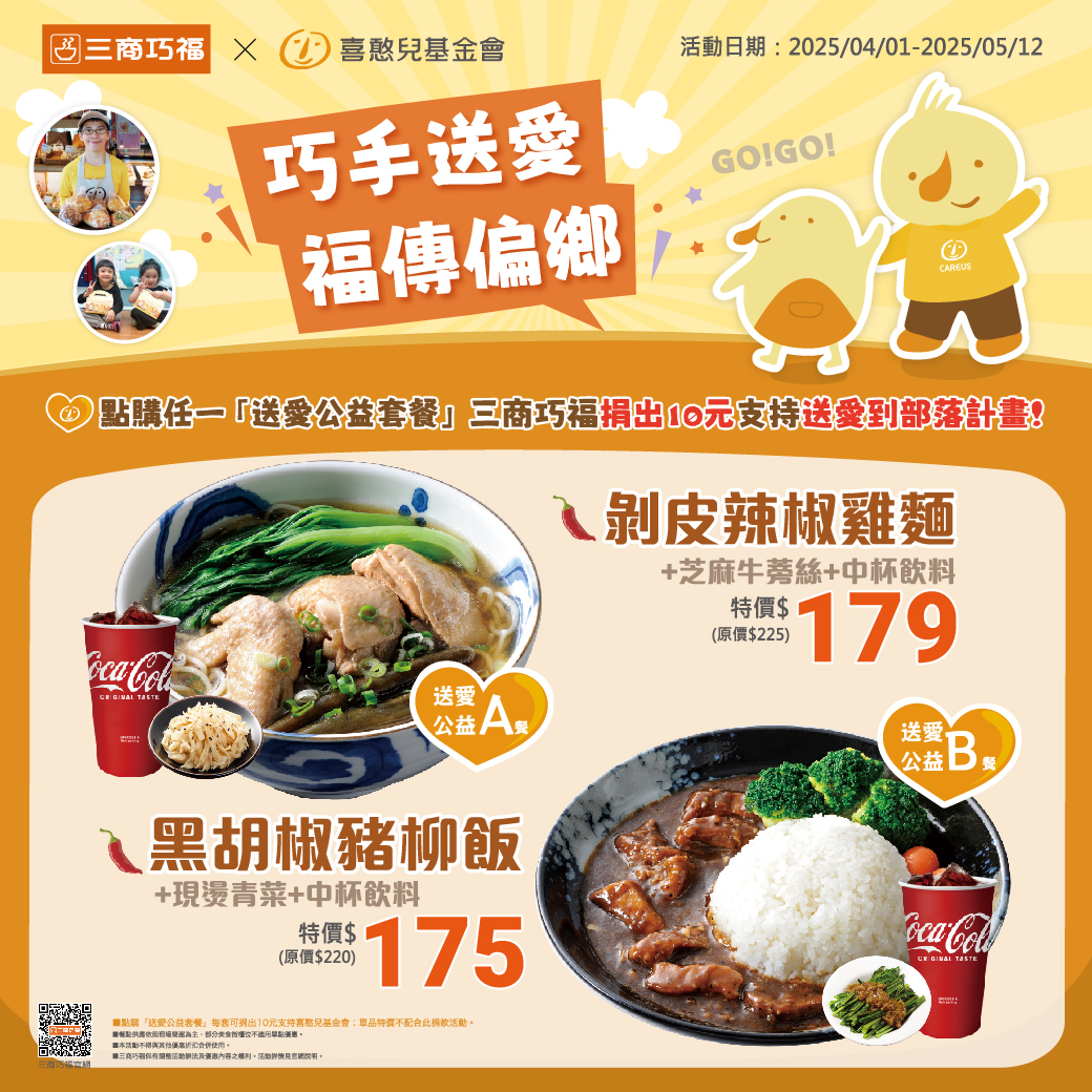 ●公益捐款活動: 點任一「送愛公益套餐」三商巧福捐出10元支持「送愛到部落計畫」